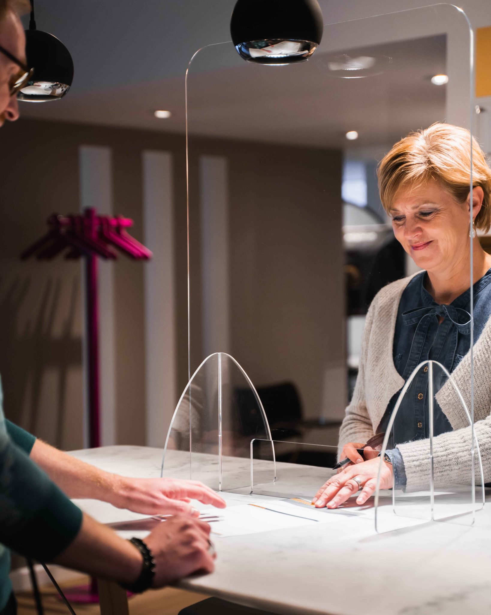 Wordt het lastig om de 1,5 meter in acht te nemen vanwege ruimtegebrek dan kunnen preventie- of spatschermen de uitkomst bieden. Deze schermen kunnen staand, hangend of geklemd aan het bureau in diverse kleuren worden aangeboden. Ook hiervoor nemen wij de tijd om een maatwerk plan voor uw organisatie op te stellen.